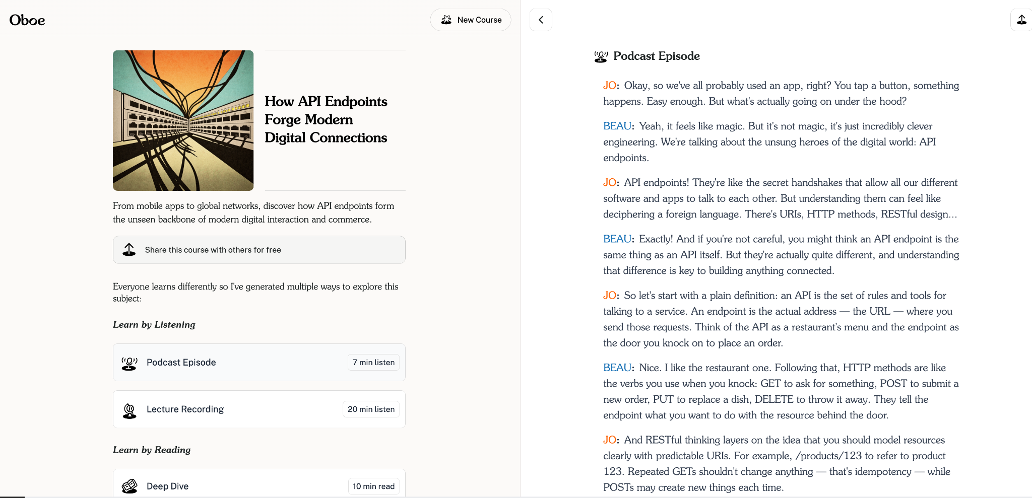 If you’re interested in learning about a specific topic, all you do in Oboe is tell it the topic you’re interested in and it will generate a custom-built course in a few minutes. The course includes a mix of different materials including: a podcast episode, lecture recording, deep dive articles, key takeaways and FAQs, multiple choice quizzes, true or false quizzes, flash cards and more.