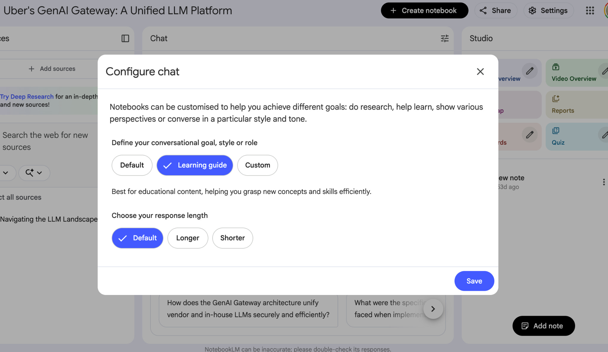 And more recently, NotebookLM released a feature called goals which lets you customize your chat inside NotebookLM to adopt a specific goal or role. If you want to focus on learning, NotebookLM comes with a new “Learning Guide” configuration that will use a conversational style that’s specifically designed to help users grasp new concepts and skills by helping you to break down problems step by step and build a deeper understanding of a subject.