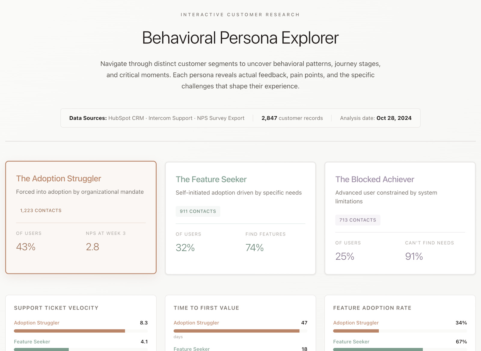 In this example, we’ll use Claude to create an Artifact that brings your product’s different user segments to life by creating demographics persona cards based on your user research. You can use this Artifact to share insights with stakeholders or use as a reference point when you’re building out new features.