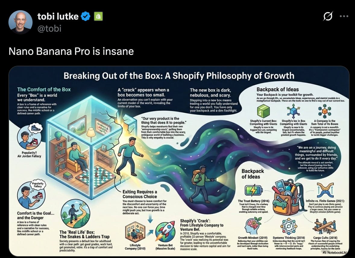 Nano Banana Pro is also a powerful addition to your learning stack. In this example, Shopify’s CEO shows how you can transform talks on YouTube into infographics by using the transcripts and asking Nano Banana Pro to turn it into an infographic. If there are specific topics of interest that you want to get visual summaries of, this is a powerful way to do it.