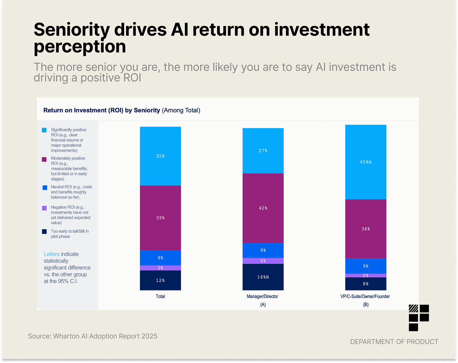 The Wharton 2025 AI adoption report shows that 74% of companies report a positive return on investment from AI initiatives, with VPs most likely to report significantly positive ROIs (45%) vs Managers / Directors at 27%. This could be an indication that those closest to the details of AI at work are more sceptical about its impact vs more senior folks who are less likely to be closer to the finer details.