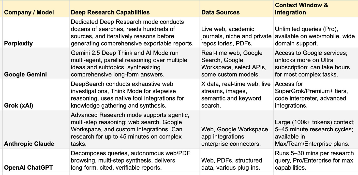 Here’s a snapshot of all of the latest Deep research capabilities on offer from each of the leading AI companies.