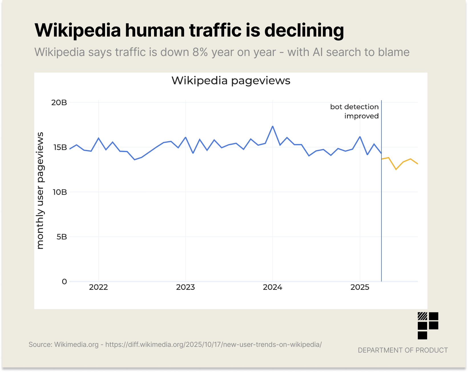 Wikipedia says human page views have dropped 8% year on year, citing generative AI as one of the factors driving the decline. âWith fewer visits to Wikipedia, fewer volunteers may grow and enrich the contentâ they warn in a new piece analysing user trends.