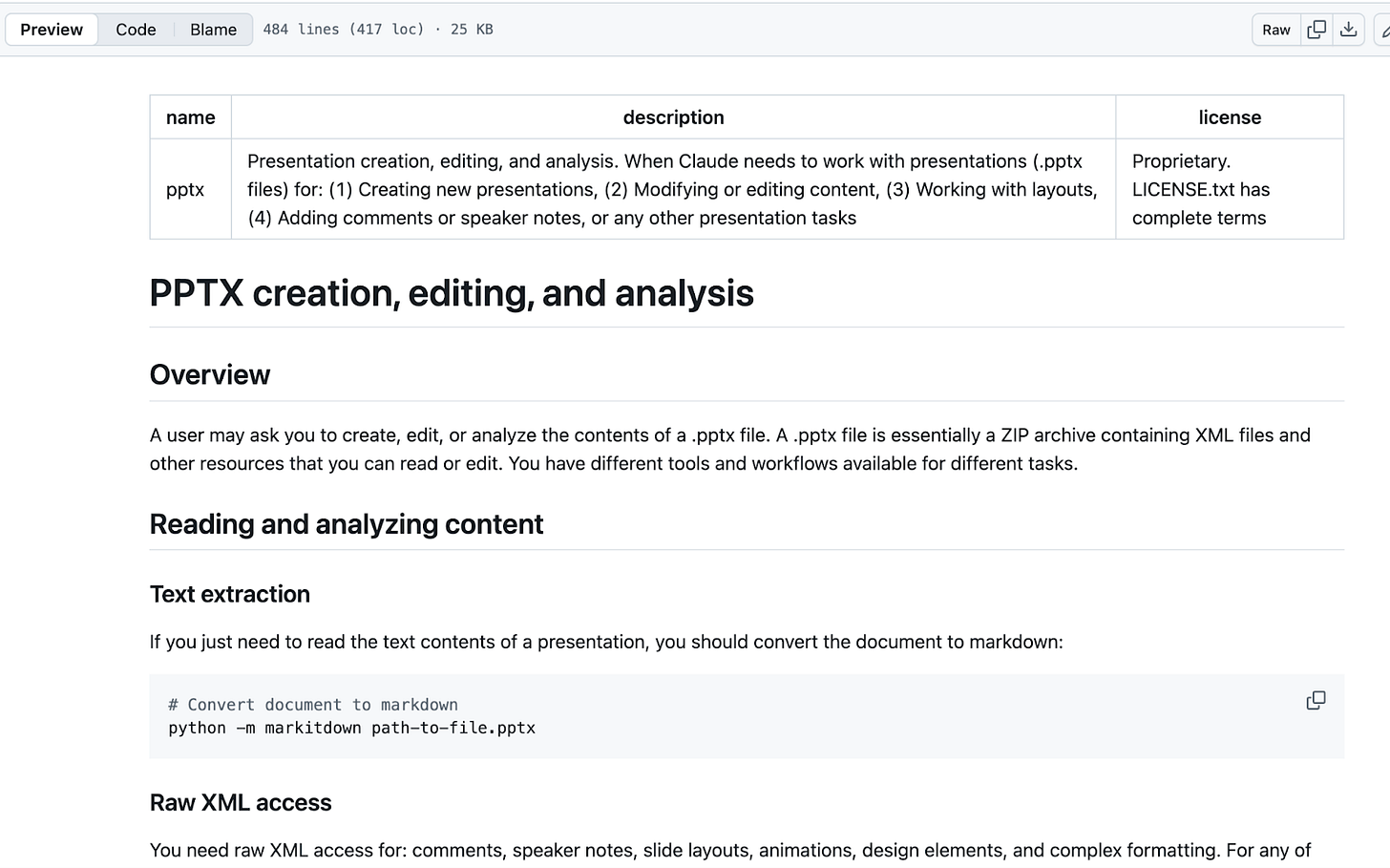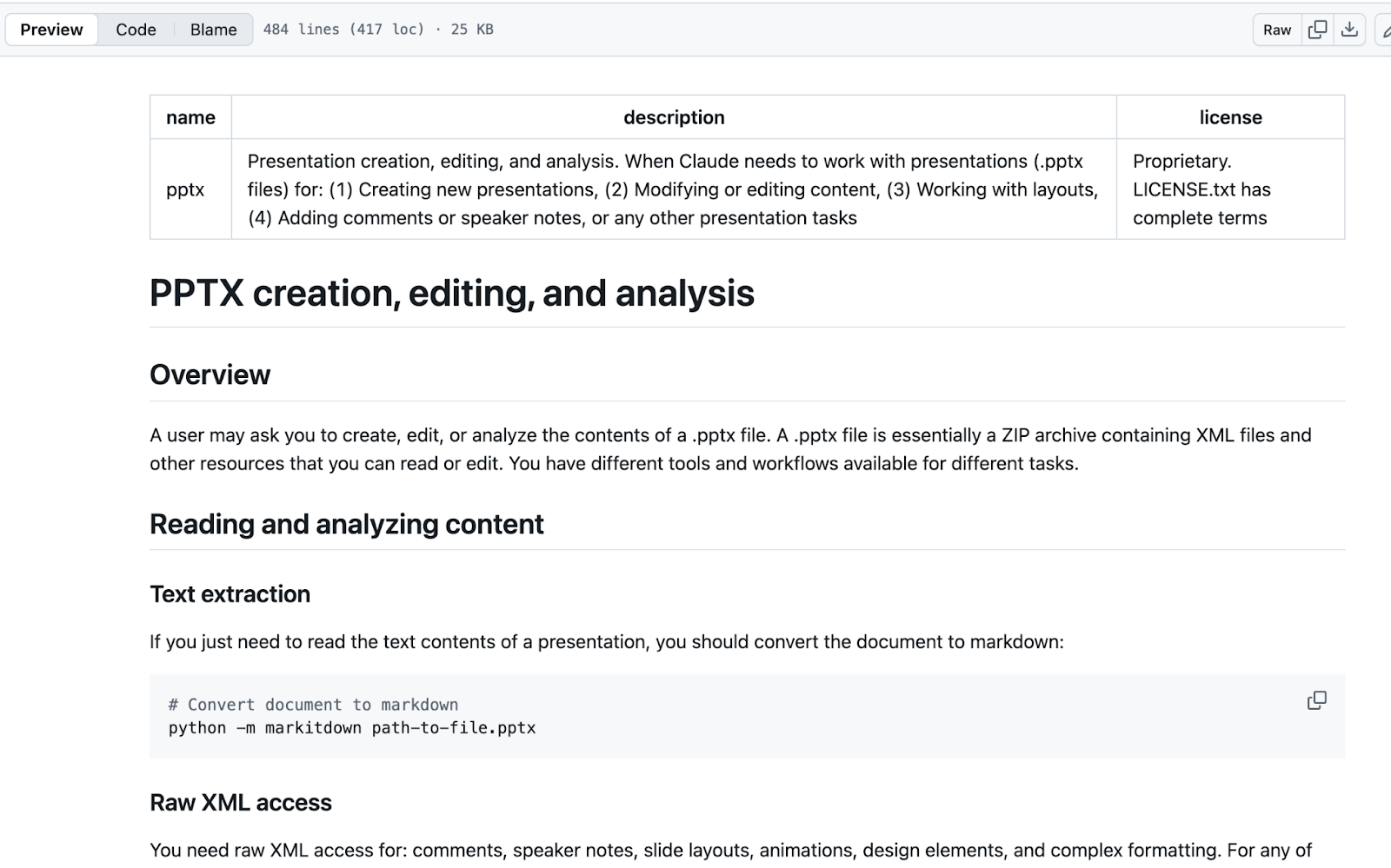 Here’s an example of a markdown file from Anthropic for its Powerpoint Skill.