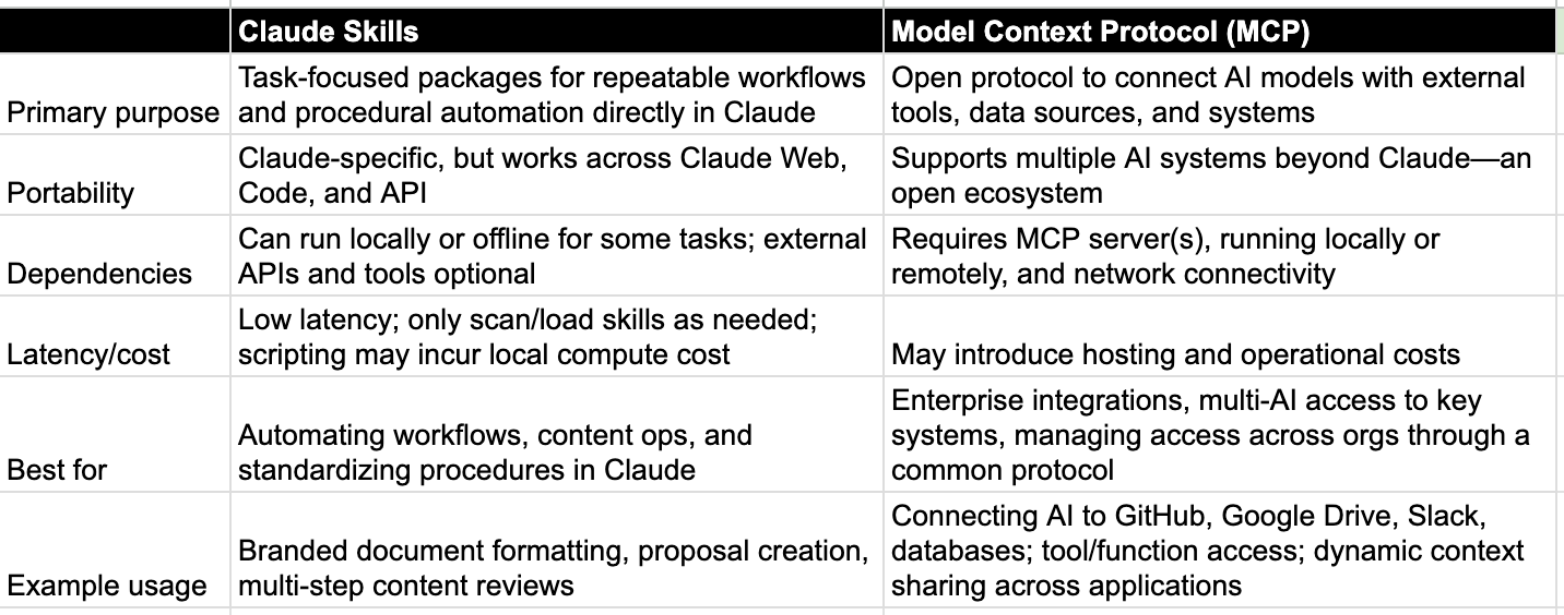 Skills are separate to MCP servers and the two can be used alongside each other. Whereas MCP is an open protocol designed to connect AI models with external tools and data sources, Skills are task-focused packages for repeatable workflows designed to be used directly inside Claude.