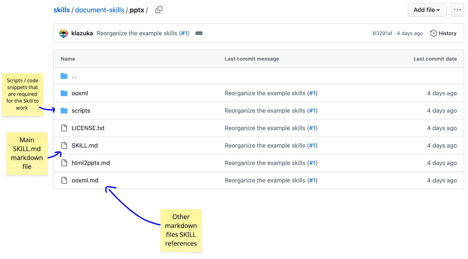 Anthropic has published a series of Skills on its GitHub repo and if we take a look at an example, you can clearly see the structure of a Skill.
