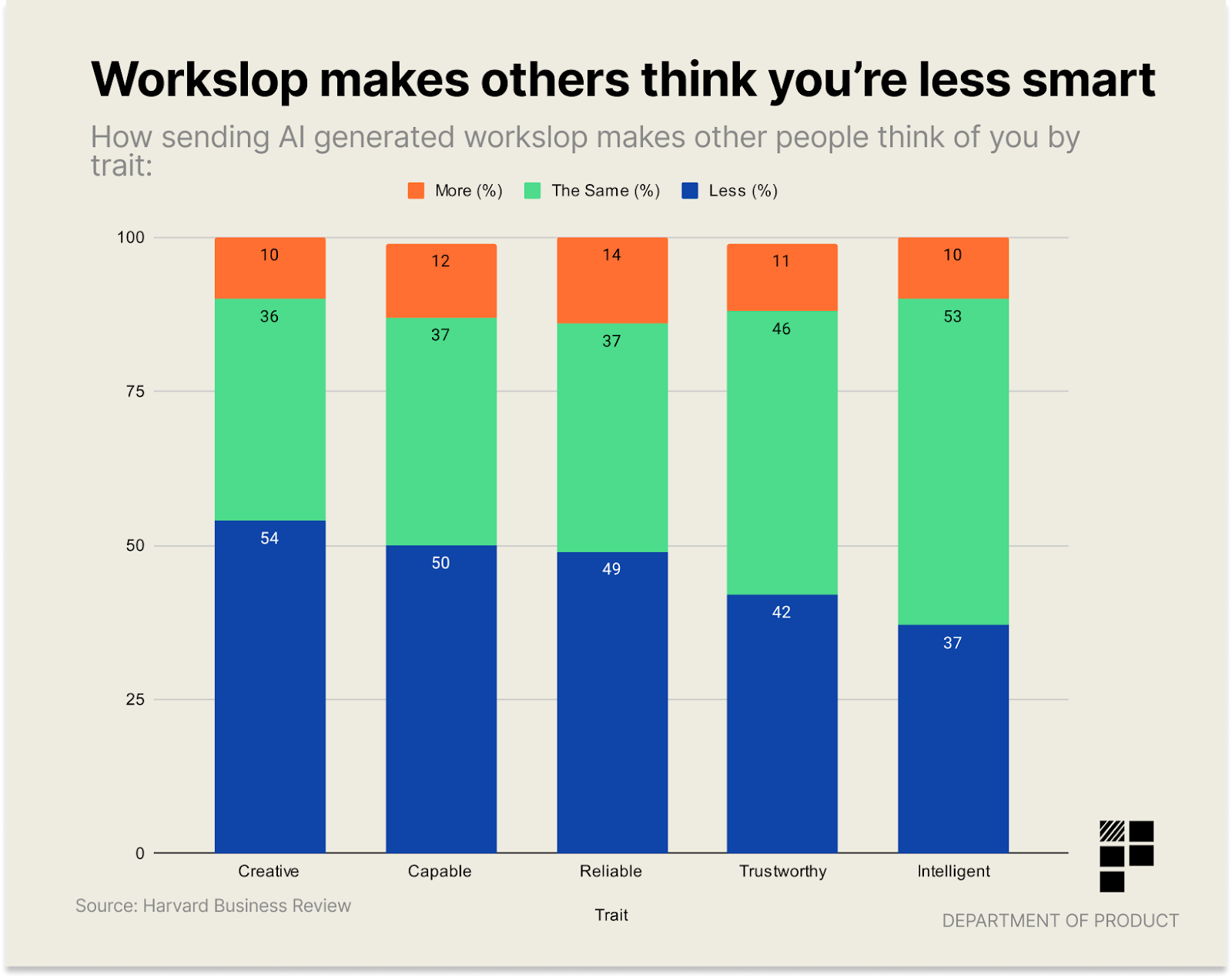 While employees might say AI makes them more productive, a new Harvard Business Review study shows that 40% of respondents had encountered what they call “workslop”. Workslop is content or other artifacts that “appears polished but lack real substance”. Researchers estimate workslop incidents costs $186 per month and 37% of workers who receive workslop view the colleague who sent it as less intelligent.